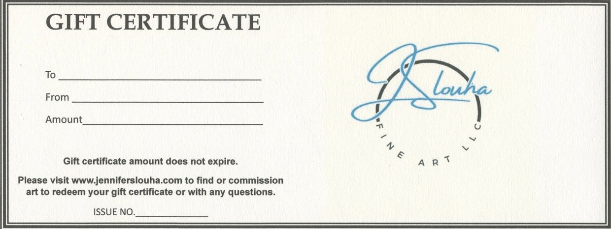 If you have ever considered giving the gift of artwork but are not quite sure what to get, gift certfiicates are a great choice. These can be made for any amount and do not expire. These printed certificates come with a handmade envelope for gifting and are mailed to you in a security envelope. The recipient can decide if they want an original piece of artwork that they choose from my website or if they want to commission a drawing of their choice. (These are not redeemable for cash). Contact me to purchase a gift certificate or if you have any questions jenniferslouhafineart@gmail.com